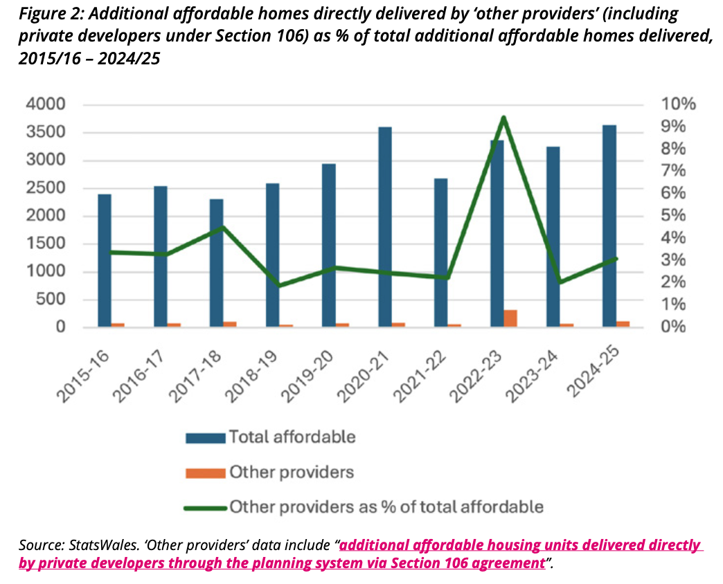 Housebuilder advocates like to quote the (unsourced) statistic that Section 106 contributed 45 per cent of affordable homes in Wales between 2021 and 2023 as evidence that private housebuilders have been doing their part. However, this is misleading. StatsWales data show that between 2021-22 and 2022-23 planning obligations delivered 29 per cent of all new affordable homes in Wales (see Figure 1). Furthermore, these data include schemes involving local authorities and registered social landlords (RSLs) that include some market tenure homes, and so are not necessarily an accurate representation of the numbers of affordable homes directly secured from private housebuilders via Section 106. When focusing only on affordable housing directly delivered by ‘other providers’ (a category in the StatsWales data which includes private developers), such entities only accounted for 6 per cent of all new affordable housing in Wales over the same period (see Figure 2). Although some of this significant discrepancy between the ‘other providers’ and the ‘planning obligations’ data could be explained by ambiguities in data collection and reporting[2], these numbers suggest that we should not accept unsourced housebuilder claims at face value and that there is a need for better national data on these issues.